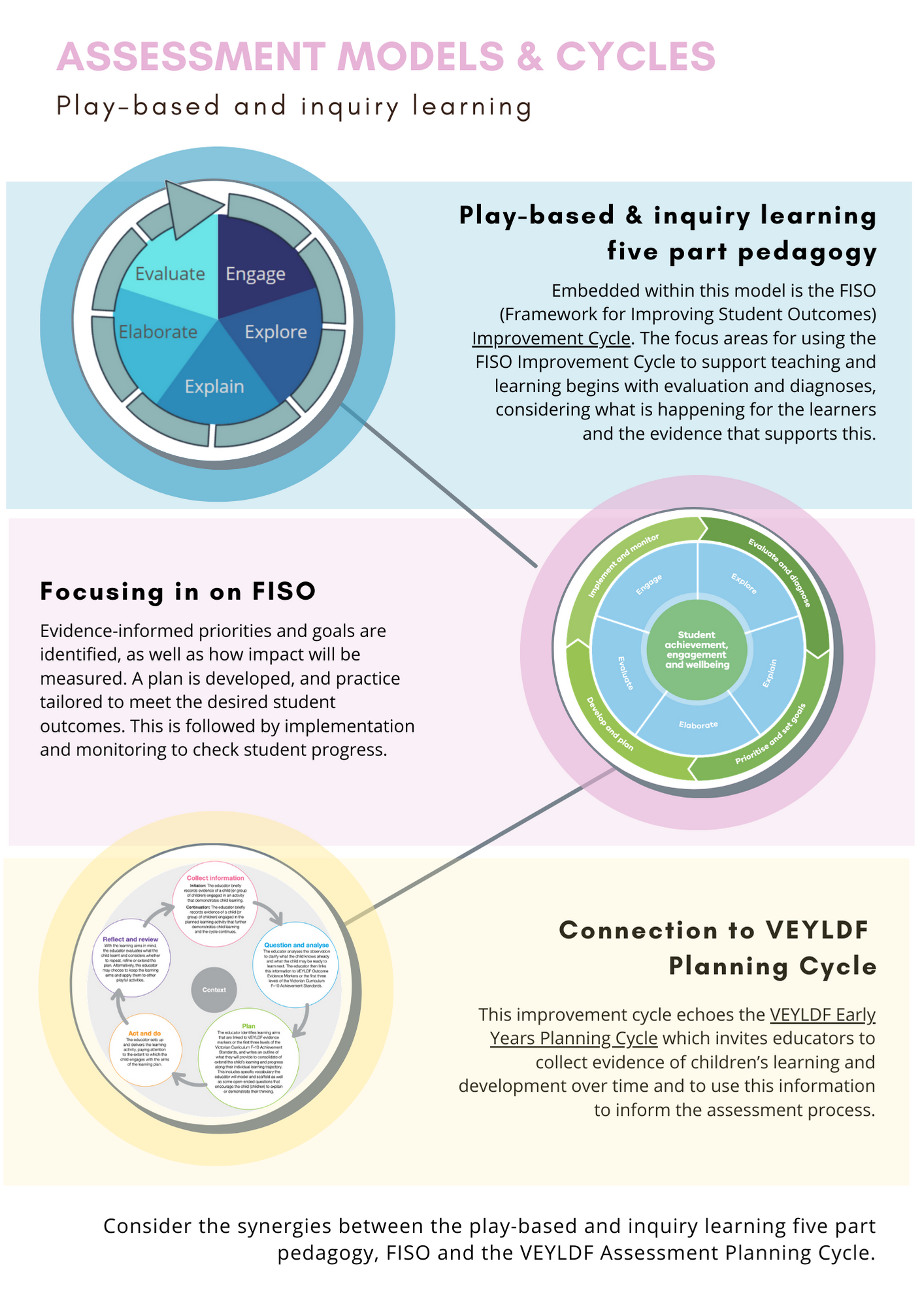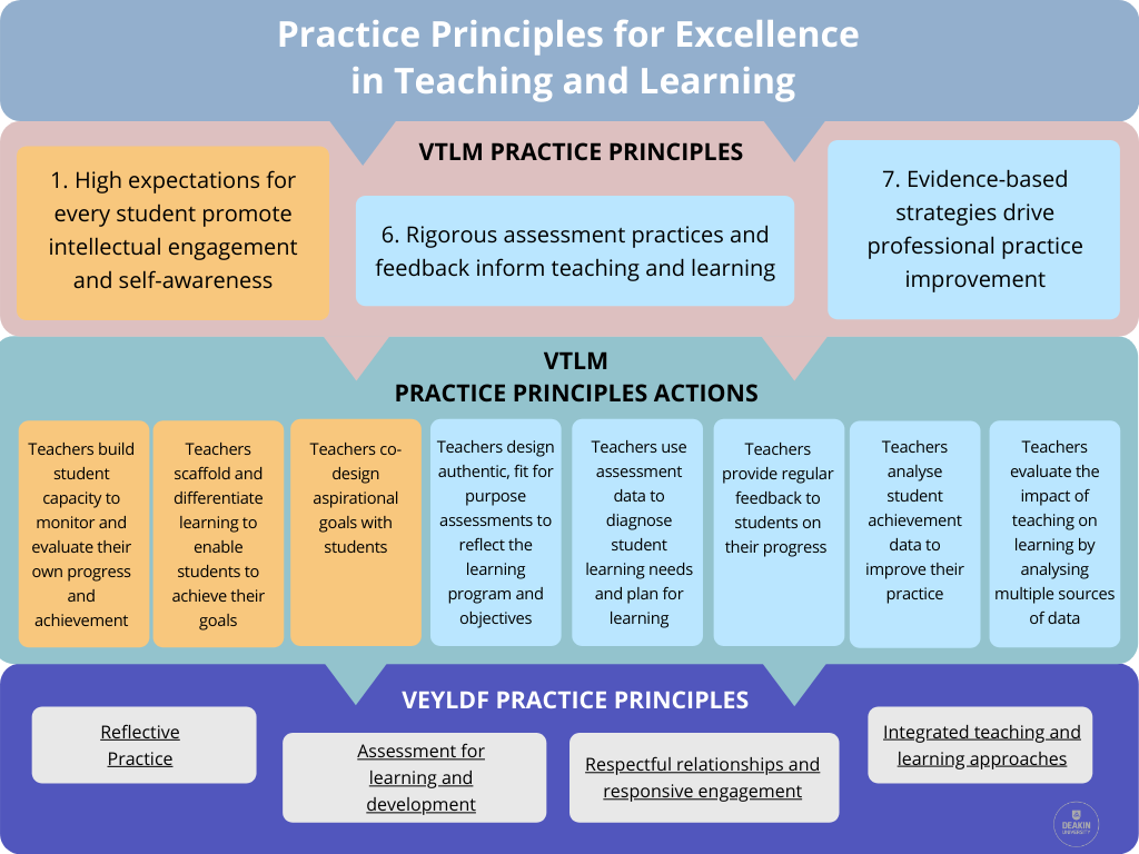The infographic below provides a visual poster of the connections between Practice Principles in the VTLM and the VEYLDF in relation to assessment. To further support your learning about the links between these documents with regards to assessment, you may find the