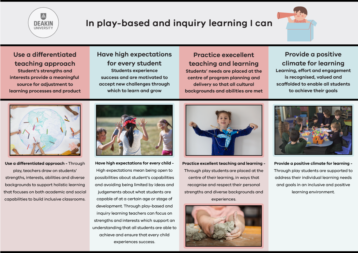 Explore the connections between differentiation and the Practice Principles for excellence in differentiation in teaching and learning in a play-based and inquiry learning approach in the poster below.