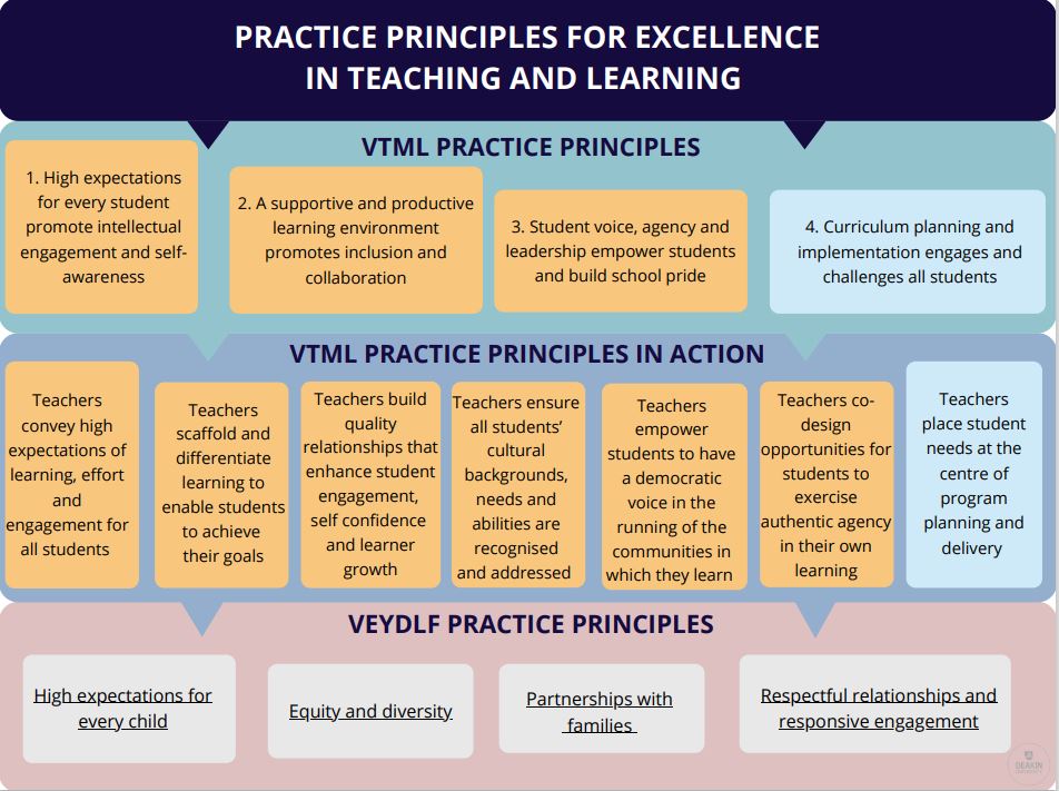 The infographic below provides a visual poster of the connections between practice principles in the VTLM and the VEYLDF in relation to differentiation in play-based and inquiry learning. To further support your learning about the links between these documents with regards to differentiation, please refer to the
